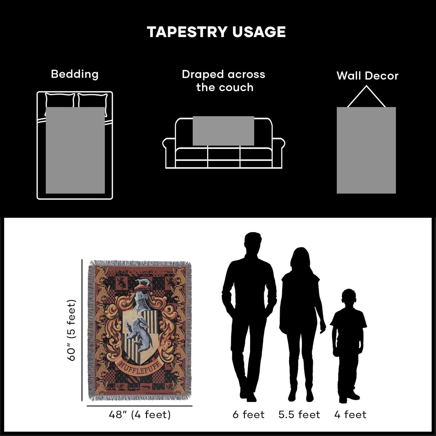 Our woven Harry Potter blankets are made from 100% Polyster and Cotton, known for its durability, breathability, and smooth texture. Available in 1 size: 46 x 59 inches.